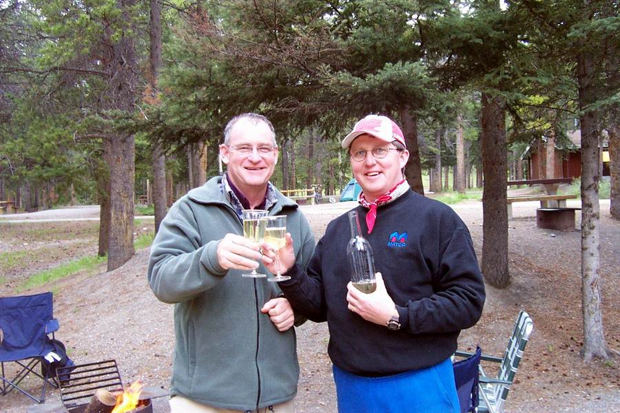 Paul and Gordon share a bottle of wine sent by another Canadian Old Prunitian -