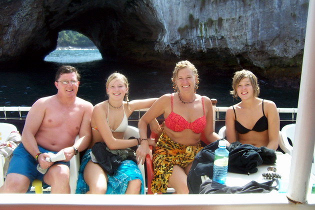 Poultney Family Album - Mexico December 2004 As we left Los Arcos after snorkelling we asked someone to take a group photo of us. Note the hole/archway in the rock behind us. Previous Photo Back to Album Next Photo