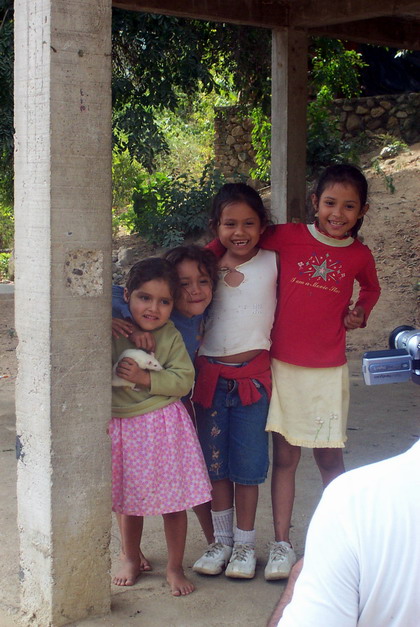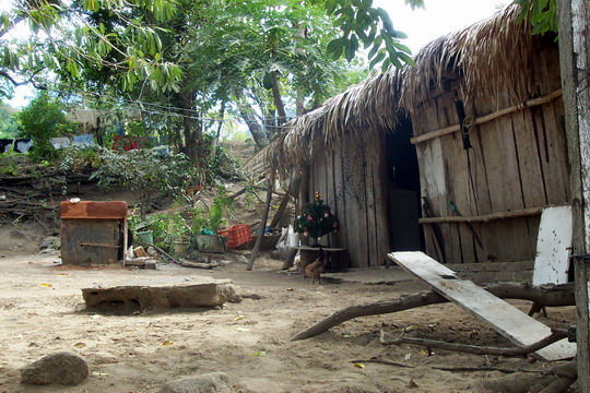 A typical scene of a rural home with a horse and chickens, a few fruit