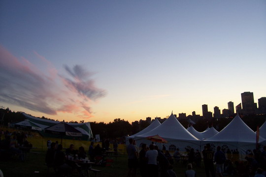Evening with cool images of the tents, city skyline and a cloud that looks like