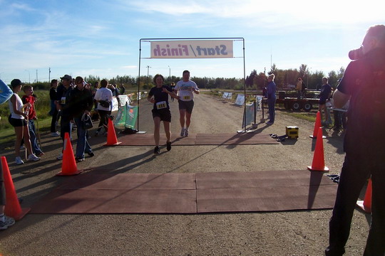 Bronwen and Gordon cross the finish line with a traditional sprint !