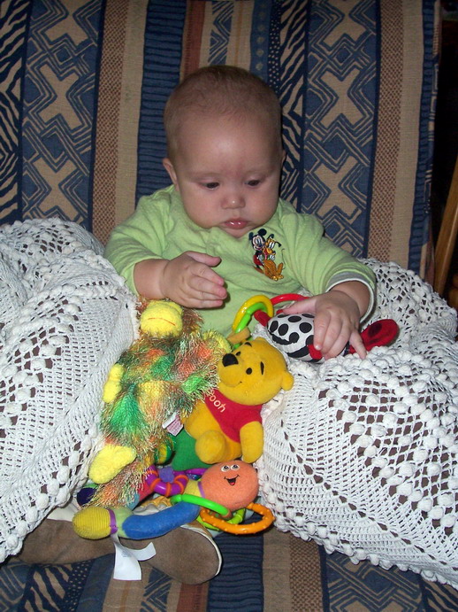 Poultney Family Album - Cai Jace I can sit up now (with the help of cushions!) and love to play with all my special toys Previous Photo Back to Album Next Photo
