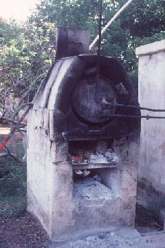 on its side, into a brick structure. Water from a nearby water tank, higher than the drum,