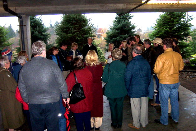 Simon Poultney Photo Album Since it was raining a bit family and friends all gathered in the underground parking garage where Rob Rhae (centre facing) conducted the short ceremony. Previous Photo Back to Album Next Photo