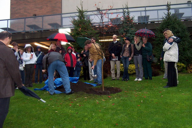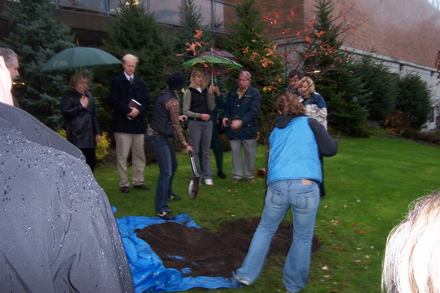 Simon Poultney Photo Album Friends and family then took turns to shovel the rest of the soil around the tree and complete the planting Previous Photo Back to Album Next Photo