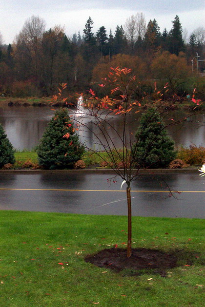 which will grow about 6-8 feet tall, will have white blossoms in the spring,